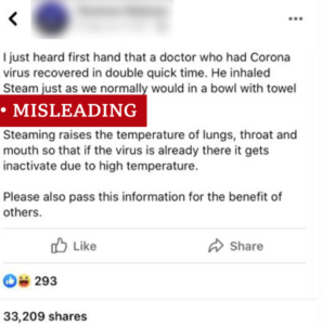 It appears to come from a Facebook user in Durham, who wrote he had heard “first hand that a doctor who had Corona virus recovered in double quick time” after inhaling steam.
