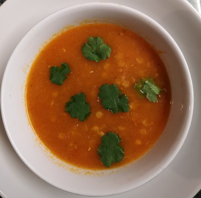 Blend until smooth and then add the red lentils. Simmer gently for another 15min.