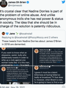 In 2015, she called another user a “fuckwit”, and two years later she described a Scottish politician as an “utterly disgusting individual”. She accused the radio presenter James O’Brien of being a “public school posh boy fuckwit” as well as an “obsessive, sexist bully”, calling another Twitter user a “patronising knob”.