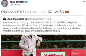 He had backed headline-grabbing writer and academic Laura McAllister’s Twitter announcement that there was less than two months before she stood for election to a football governing body’s council.