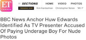 Entertainment Canada has reported: “BBC News Anchor Huw Edwards identified as TV Presenter Accused Of Paying Underage Boy For Nude Photos”.